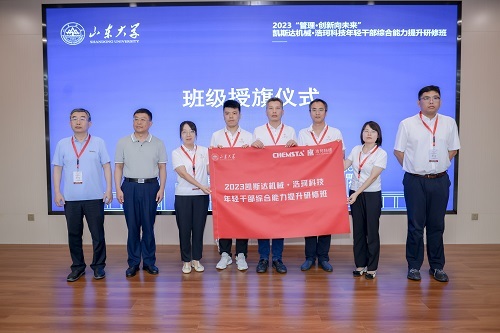 7月29日,由山东大学管理学院举办的“2023‘管理•创新向未来’凯斯达机械•浩珂科技年轻干部综合能力提升研修班”在山东凯斯达机械制造有限公司举行开班仪式。济宁高新区党工委委员、组织部长刘伟宏、山东大学管理学院党委书记孟庆春、山东凯斯达机械制造有限公司董事长兼总经理张明、浩珂科技有限公司总经理崔鑫、全体学员出席开班仪式。