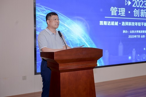孟庆春致辞中首先代表山东大学管理学院对本次培训班顺利开班表示祝贺,欢迎大家走进山东大学的课堂。他介绍了山东大学的百年历史沿革、发展及社会服务的相关情况,孟书记强调党的二十大报告围绕全面建成社会主义现代化强国,专立一章:“实施科教兴国战略,强化现代化建设人才支撑”,明确提出“教育、科技、人才是全面建设社会主义现代化国家的基础性、战略性支撑”,明确强调“必须坚持科技是第一生产力、人才是第一资源、创新是第一动力”。山东大学管理学院及高层管理教育中心将继续深化与山东凯斯达机械•浩珂科技战略合作,校企强强联合,把此次人才培养合作项目打造成为政产学研的标杆项目、示范项目。