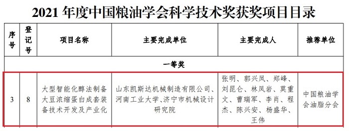 2021年11月10日,2021年度中国粮油学会科学技术奖获奖项目名单公布,“大型智能化醇法制备大豆浓缩蛋白成套装备技术开发及产业化”项目喜获一等奖。