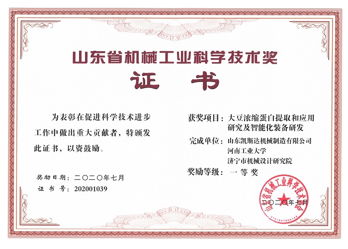 近日,2020年度山东省机械工业科技进步奖评审结果出炉,山东凯斯达机械制造有限公司与河南工业大学、济宁市机械设计研究院联合申报的“大豆浓缩蛋白提取和应用研究及智能化装备研发”项目荣获2020年山东省机械工业科技进步一等奖。