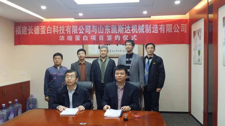 我公司与福建长德蛋白科技有限公司的功能型浓缩蛋白加工项目签约仪式2016年1月6日在福州创银大厦隆重举行。福建长德蛋白科技有限公司董事长张华国先生、山东凯斯达机械制造有限公司董事长张明先生出席签字仪式。